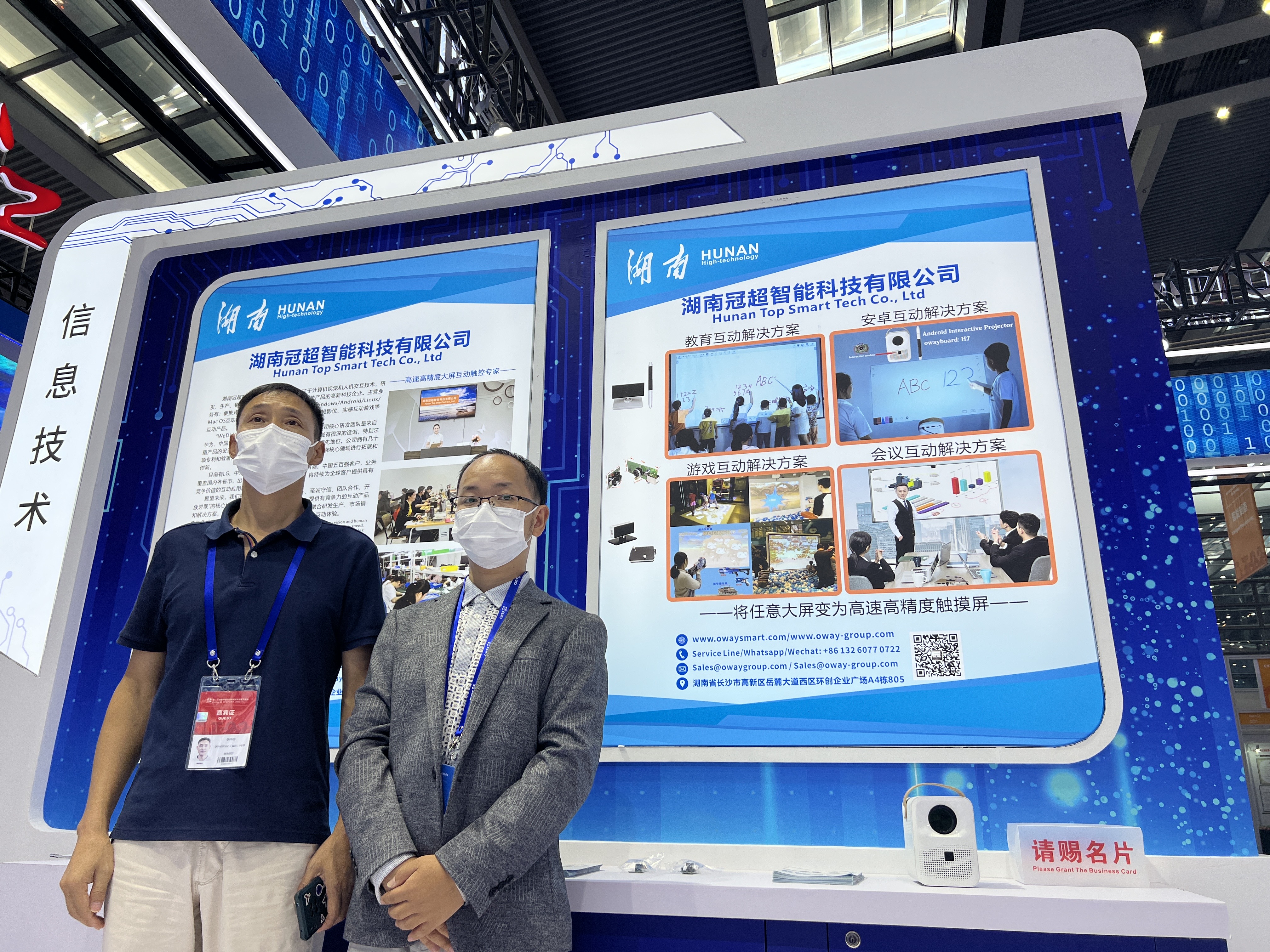 在展会中,湖南冠超智能科技有限公司演示了多种互动设备包括便携式触控互动电子白板进行书写,互动游戏吸引同行以及参观者的注意,进行技术交流,经验分享,并得到了一致的好评与赞扬。