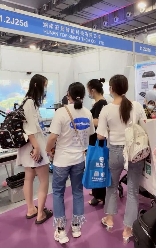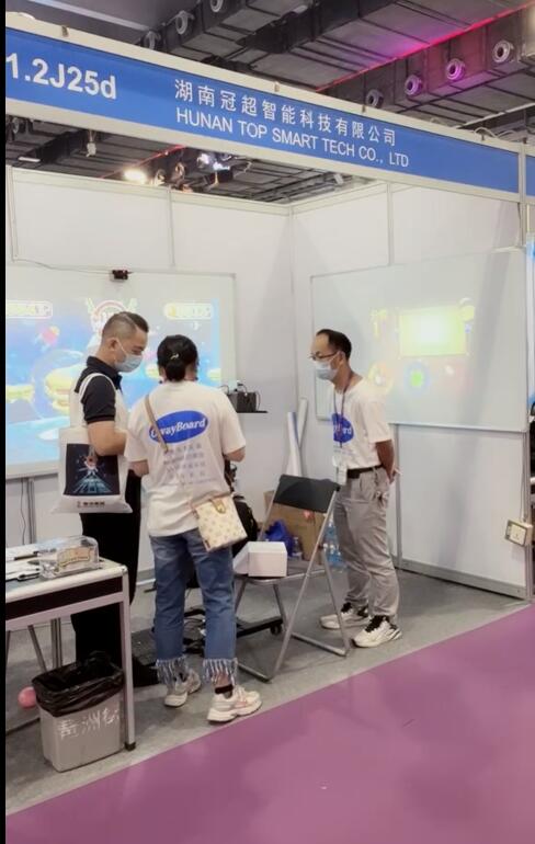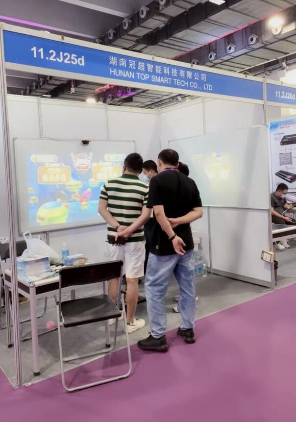 高精度极速反应触控系统,吸引了众多中外客商驻足观看与咨询洽谈。也有不少客户给与了许多的赞扬与好评,其中像淘气堡游戏厂家和培训机构都提出OWAY的互动设备精准度高,误差精准到1mm内。反应速度也比同行快。众多客户对此非常满意,并在现场达成购买意愿。
